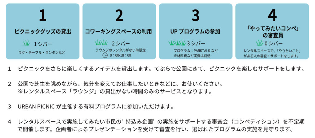 アーバンピクニッククラブに登録していただくと、「東遊園地を育てる」いくつかのメニューをご利用いただけます。 シバーに換算したメニューを、合計で「10シバー」ご利用いただけます。